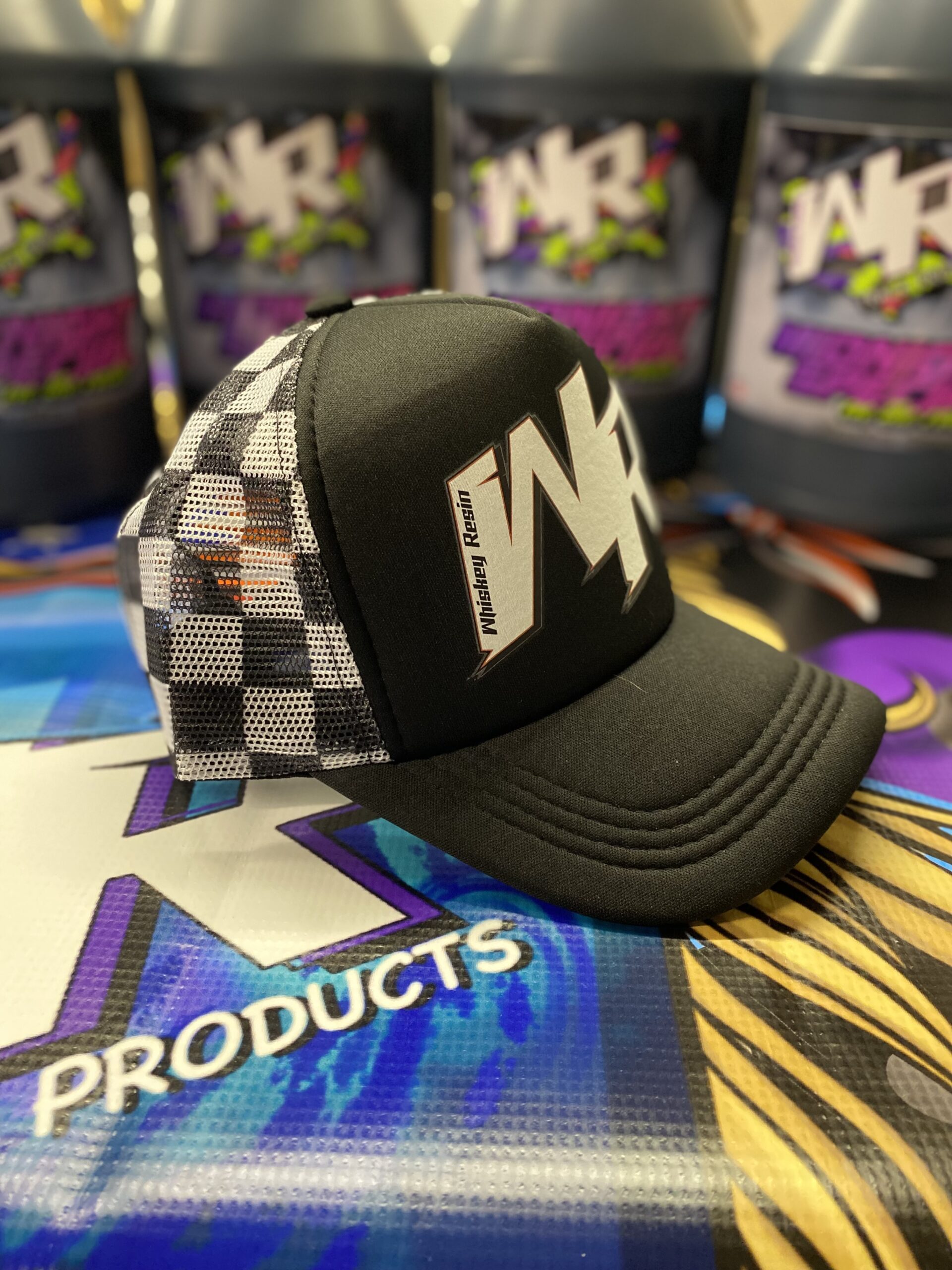 AWESOME CHECKERED FLAG WR (WHISKEY RESIN) TRUCKER FOAM HATS. BLACK FRONT.